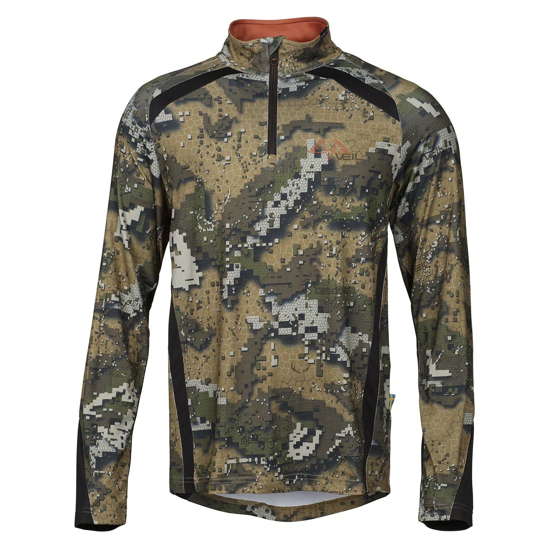 #100403 SWEDTEAM Džemperis Alpha Antibite Šis Swedteam džemperis izgatavots no pārstrādāta poliestera. Tas medību vai citu aktivitāšu laikā ļauj apvienot komfortu un funkcionalitāti. Vieglais audums padara to par lielisku alternatīvu flīsa džemperim. Tas derēs lietošanai pavasarī un agrā rudenī, kad nepieciešams arī aktīvi kustēties. Materiāls ir ātri žūstošs un elpojošs. Tas neļauj ādai uzkrāt sviedru slāni pat intensīvu aktivitāšu laikā. Pateicoties apkakles daļas rāvējslēdzējam, varēsi viegli regulēt ventilāciju silta laikā un aizvērt to, kad gribas vairāk saglabāt siltumu. Džemperim ir DESOLVE® Veil kamuflāžas raksts, kas ļauj to medību situācijās izmantot arī kā virsējo slāni - kamuflāžas raksts mednieku paslēps uz apkārtējās vides fona. Tam ir standarta piegriezums, kas nodrošina kustību brīvību. Džemperim ir arī Antibite™ apstrāde, kas ļauj sevi pasargāt pret ērcēm un odiem. Šī apstrāde savu efektivitāti saglabā līdz pat 80 mazgāšanas reizēm. Džemperis ir veidots kā samēra pieguļošs, un tas atbilst ierastajam izmēram. Ja vēlies, lai tas ir mazāk pieguļošs un brīvāks, ieteicams izvēlēties vienu izmēru lielāku nekā parasti.