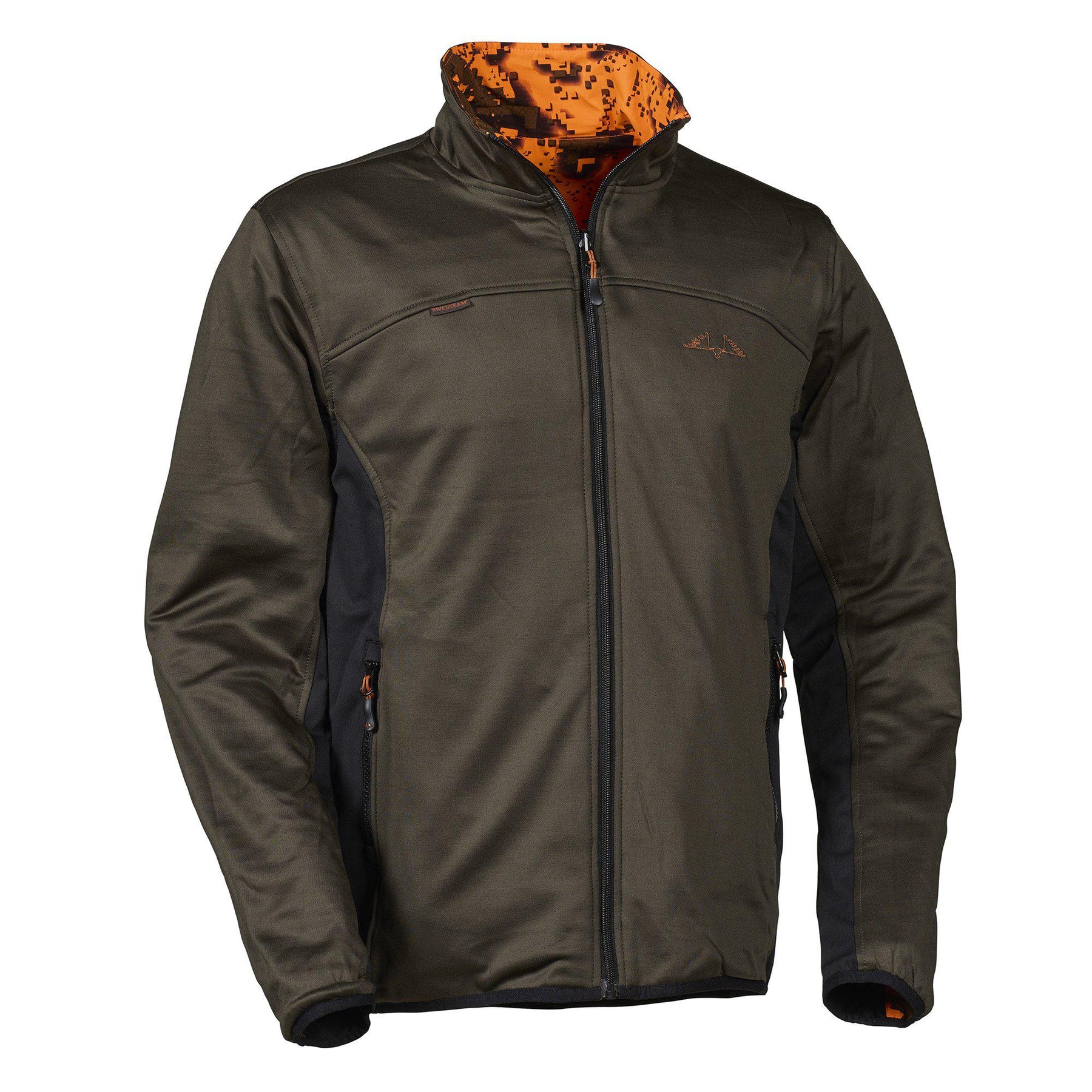 #100475 SWEDTEAM Virsjaka Ridege Pro divpusējā Fire Šī Swedteam jaka ir šūta pēc klasiska dizaina, tajā ir iestrādāta WINDBREAKER® membrāna, kas palīdz ķermeni pasargāt pret vēju un tā saglabāt siltumu. Šī iemesla dēļ arī apkakle ir nedaudz paaugstināta. Viena puse ir vienkrāsaini tumši brūna, bet otra puse ir ar DESOLVE® FIRE kamuflāžas rakstu oranžā krāsā. Tas ir izstrādāts, ņemot vērā dzīvnieku redzes īpatnības, līdz ar to, pateicoties rakstam, būsi neredzams dzīvnieka acīm, bet spilgti pamanāms kolēģim. Jaku var lietot ar jebkuru no krāsām uz ārpusi. Piemēram, dodoties medībās, izvēlies oranžo pusi, bet ikdienā - brūno pusi. Abos sānos ir praktiskas kabatas, kurās vari glabāt dokumetus, cimdus, telefonu vai ko citu. To aizdarēs iestrādāti rāvējslēdzēji, lai mantas nevarētu nejauši izkrist. Aproces ir elastīgas, tās pieguļ rokām. Šo jaku ieteicams lietot kā otro vai trešo slāni.
