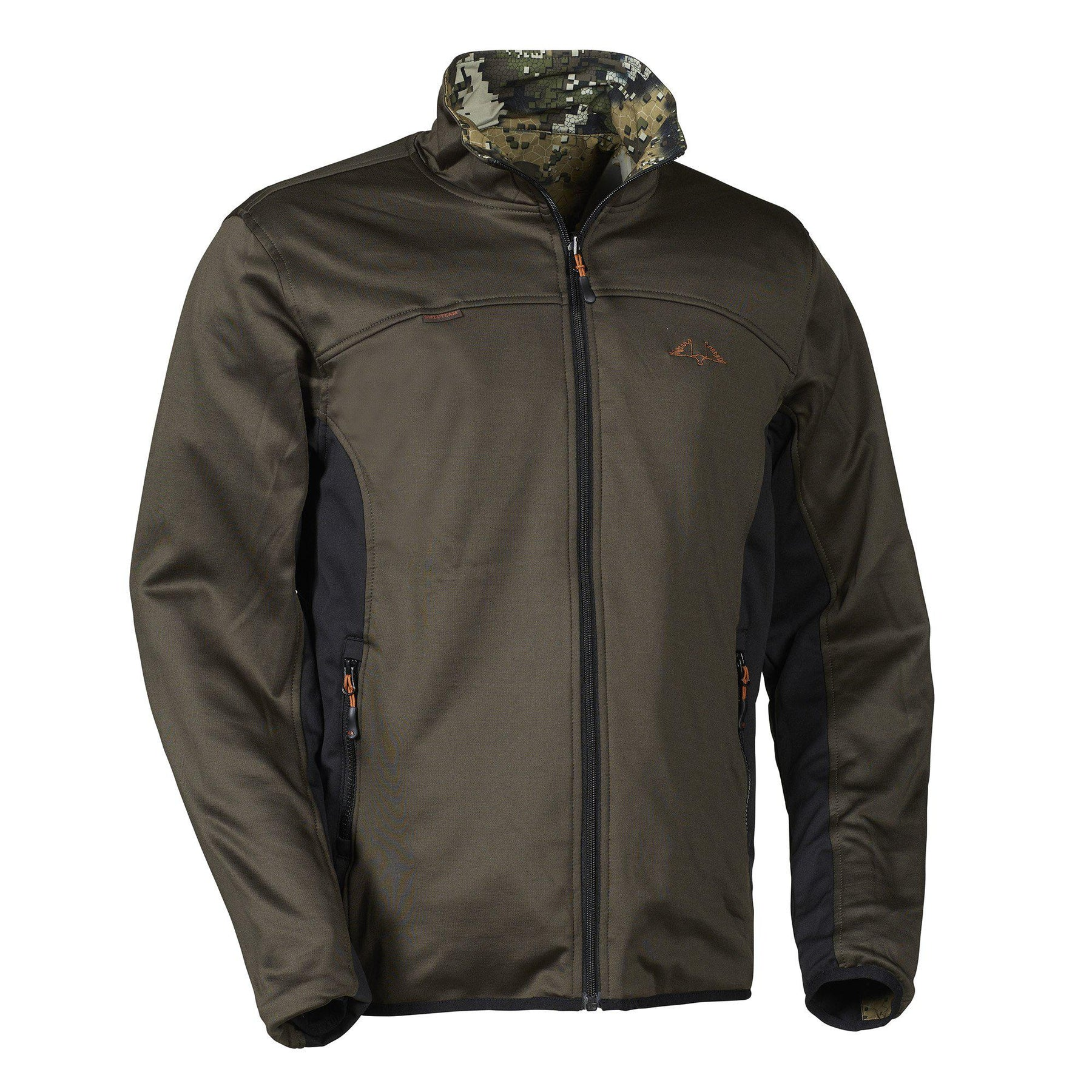 #100475 SWEDTEAM Virsjaka Ridege Pro divpusējā Veil Šī Swedteam jaka ir šūta pēc klasiska dizaina, tajā ir iestrādāta WINDBREAKER® membrāna, kas palīdz ķermeni pasargāt pret vēju un tā saglabāt siltumu. Šī iemesla dēļ arī apkakle ir nedaudz paaugstināta. Viena puse ir vienkrāsaini tumši brūna, bet otra puse ir ar DESOLVE VEIL® kamuflāžas rakstu. Tas ir kontrastains un izstrādāts, ņemot vērā dzīvnieku redzes īpatnības, līdz ar to palīdz vēl labāk nomaskēties un saplūst ar apkārtējās vides fonu. Jaku vari lietot ar jebkuru no krāsām uz ārpusi. Piemēram, medībās ar kamuflāžu uz ārpusi, bet ikdienā ar brūno krāsu uz āru. Abos sānos ir praktiskas kabatas, kurās vari glabāt dokumetus, cimdus, telefonu vai ko citu. To aizdarēs iestrādāti rāvējslēdzēji, lai mantas nevarētu nejauši izkrist. Aproces ir elastīgas, tās pieguļ rokām. Šo jaku ieteicams lietot kā otro vai trešo slāni.