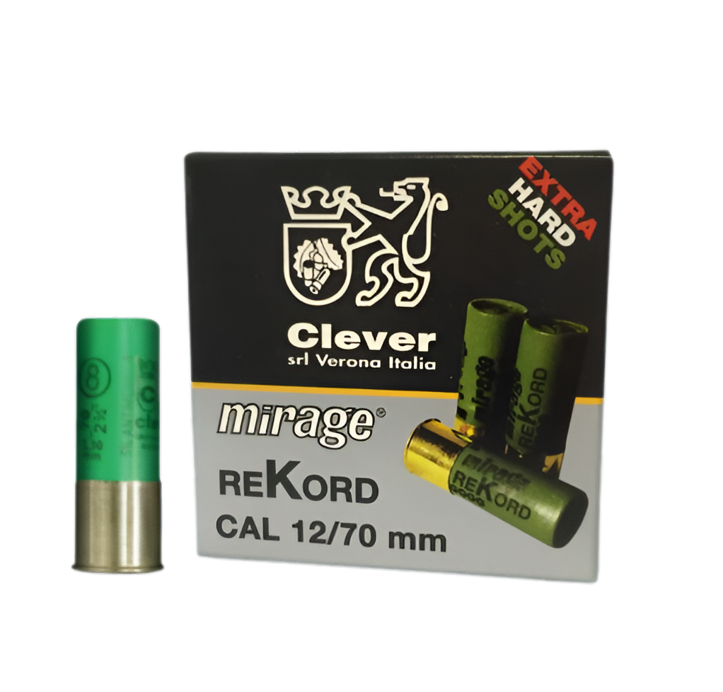 CLEVER Patronas Mirage 12/70 SOFT STEEL REKORD 32g Clever ir panākumiem bagāts Itālijas munīcijas ražotājs, kura produktus ir iecienījuši gan mednieki, gan pieredzējuši sporta šāvēji dažādās pasaules valstīs. Šī ir bezsvina munīcija, tādēļ to ir droši atļauts lietot arī mitrāju teritorijās. Derēs 12. kalibra ierocim ar patrontelpas dziļumu ne mazāku kā 70 milimetri. Katrs iepakojums satur 25 patronas. Munīcijas izmēri: #3 - ø 3,3 mm #4 - ø 3,1 mm