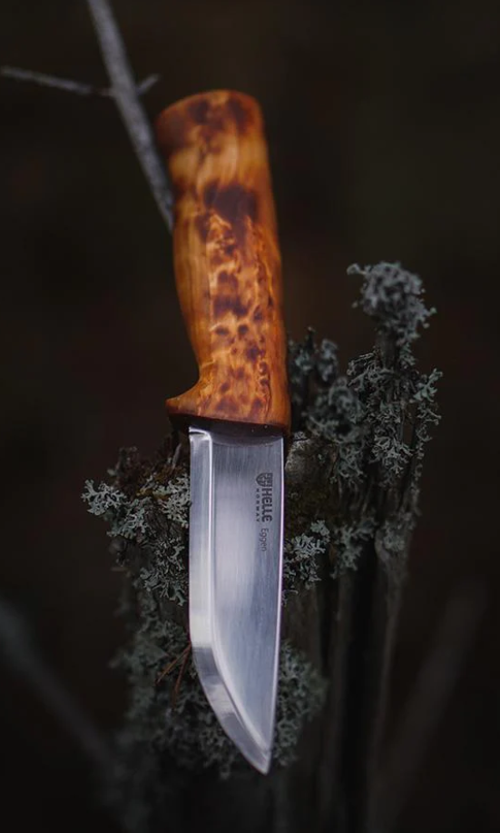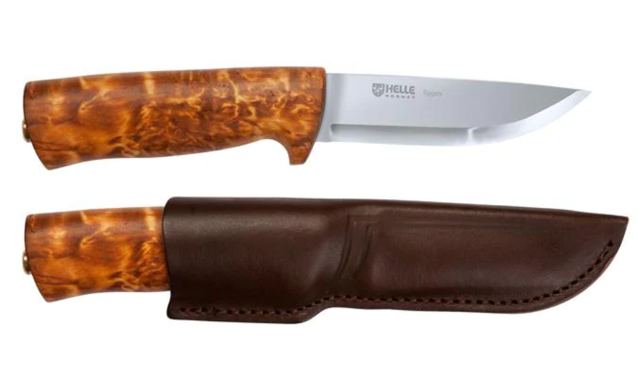 #200075 HELLE Knife EGGEN Eggen has a beautiful handle, crafted out of one piece of selected curly birch, sanded and polished to a satin finish. The well-shaped handle finishes off towards the blade with a well-proportioned finger guard for safety. The triple laminated stainless-steel blade has a slight drop point shape and a classic scandi grind. Hand sharpened and polished to give it that extra edge right out of the box. The Eggen knife is one of the staff favorites and also a favorite of many users around the world. This is as a true all-round knife, recommended for a wide range of tasks. Delivered with a sheath of genuine high-quality leather and a belt loop for secure carry on the belt.