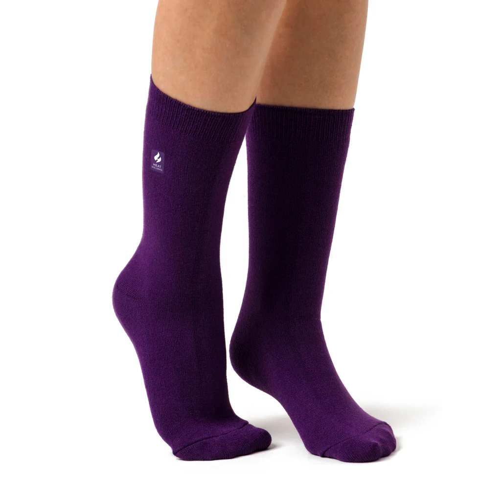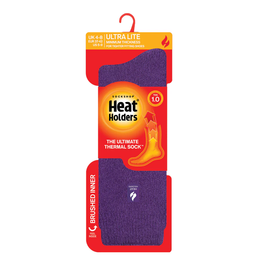 #UTLHH201NVY HEAT HOLDERS Women's socks ULTRA LITE PLAIN HOLLY These Ladies Ultra Lite Holly Socks in Purple are specially designed to fit comfortably inside tighter-fitting and formal shoes. With an amazing 1.0 TOG rating, these thermal socks are three times warmer than a basic cotton sock, so you get more of our famous thermal protection with less of the bulk. Formal and tighter-fitting shoes can often feel cold to wear. Not only do they offer less insulation than casual shoes, but most of the socks that will fit inside them provide little or no thermal protection.