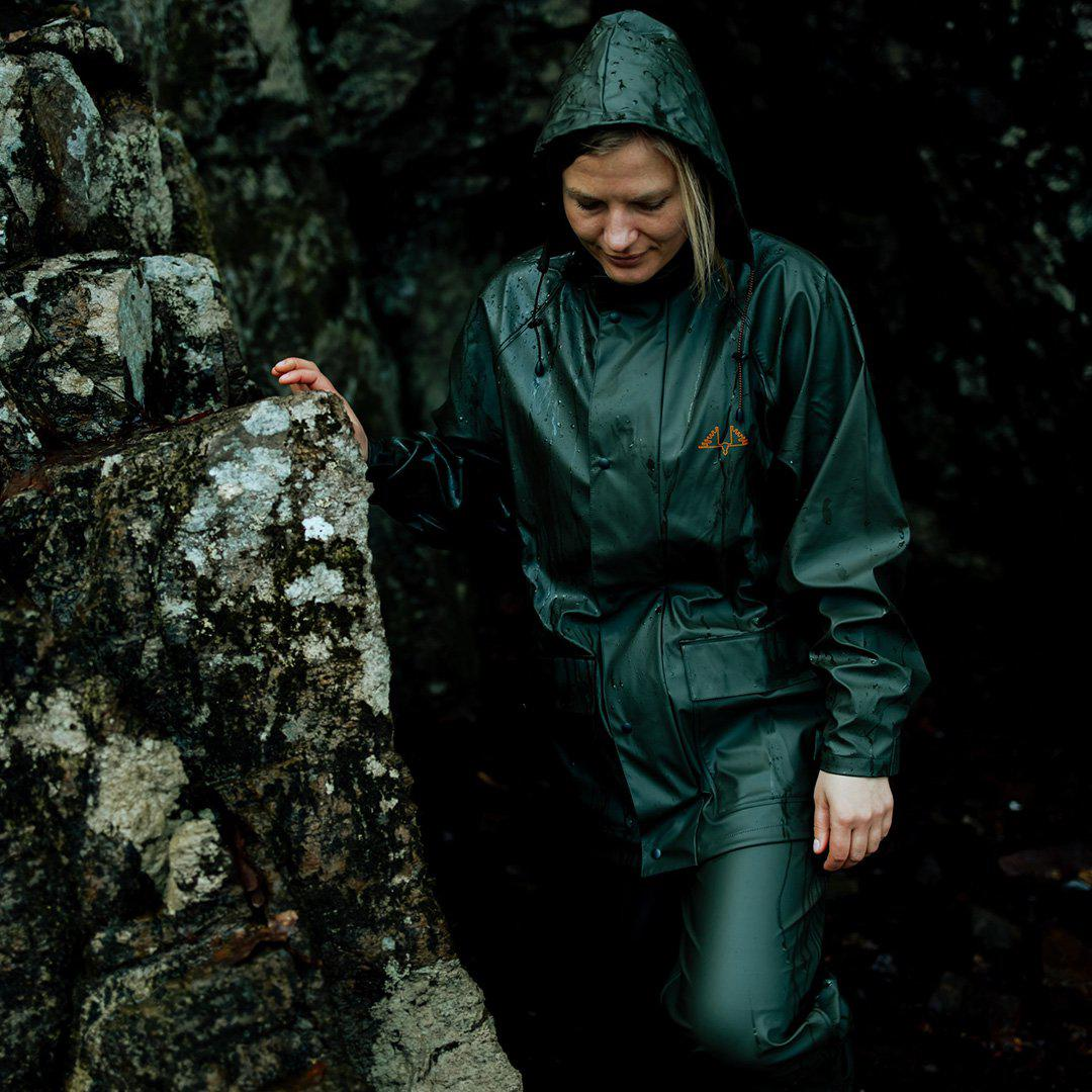 #100494 SWEDTEAM Lietus kostīms CREST Apģērba komplekts, kas ļaus izbaudīt āra aktivitātes arī sliktos laikapstākļos. Pagarinātajai jakai ir regulējama kapuce, divas kabatas priekšpusē, kur salikt nepieciešamās mantas. Kabatām ir kniedējamas aizdares. Apkakles daļa ir paaugstināta, lai pasargātu kaklu no vēja. Aprocēs ir iestrādātas līplentes aizdares, kas ļauj aproces precīzi pielāgot plaukstas locītavas izmēram un neļauj zem apģērba pakļūt mitrumam. Garajām biksēm ir ventilējama jostasvieta, lai novērstu pārmērīgu svīšanu. Arī staru gali ir ar regulējamu platumu, lai tie precīzi piekļautos apaviem un tiem garām netiktu mitrums. Abiem apģērbiem iekšpusē iestrādāts mīksts un patīkams poliesters.