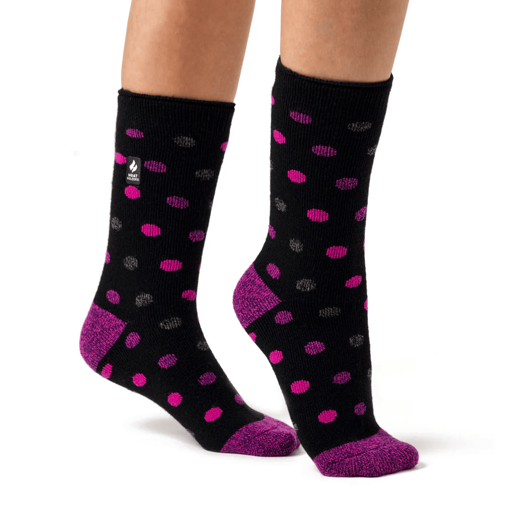 #LTLHH604G1BBR HEAT HOLDERS Sieviešu zeķes LITE DOTS MALAGA Šīm zeķēm TOG (Thermal Overall Grade jeb termālās noturības rādītājs) ir 1,6. Tas nozīmē, ka šīs zeķes ir četras reizes siltākas, nekā parastas kokvilnas zeķes, kā arī īpaši mīkstas un ērtas. Tās sniedz ideālu balansu starp biezumu un siltumnoturību. Lieliski derēs nēsāšanai ikdienas apavos ziemā. Tās ražotas no progresīvas termālās dzijas. Iekšpusē pavedieni veidoti vidēji garās cilpās, kas virspusē spurojas, tā izveidojot mīkstu un biezu iekšējo kārtu. Šī pūkainā odere veido vietu, kur pie ādas uzkrāties siltajam gaisam.