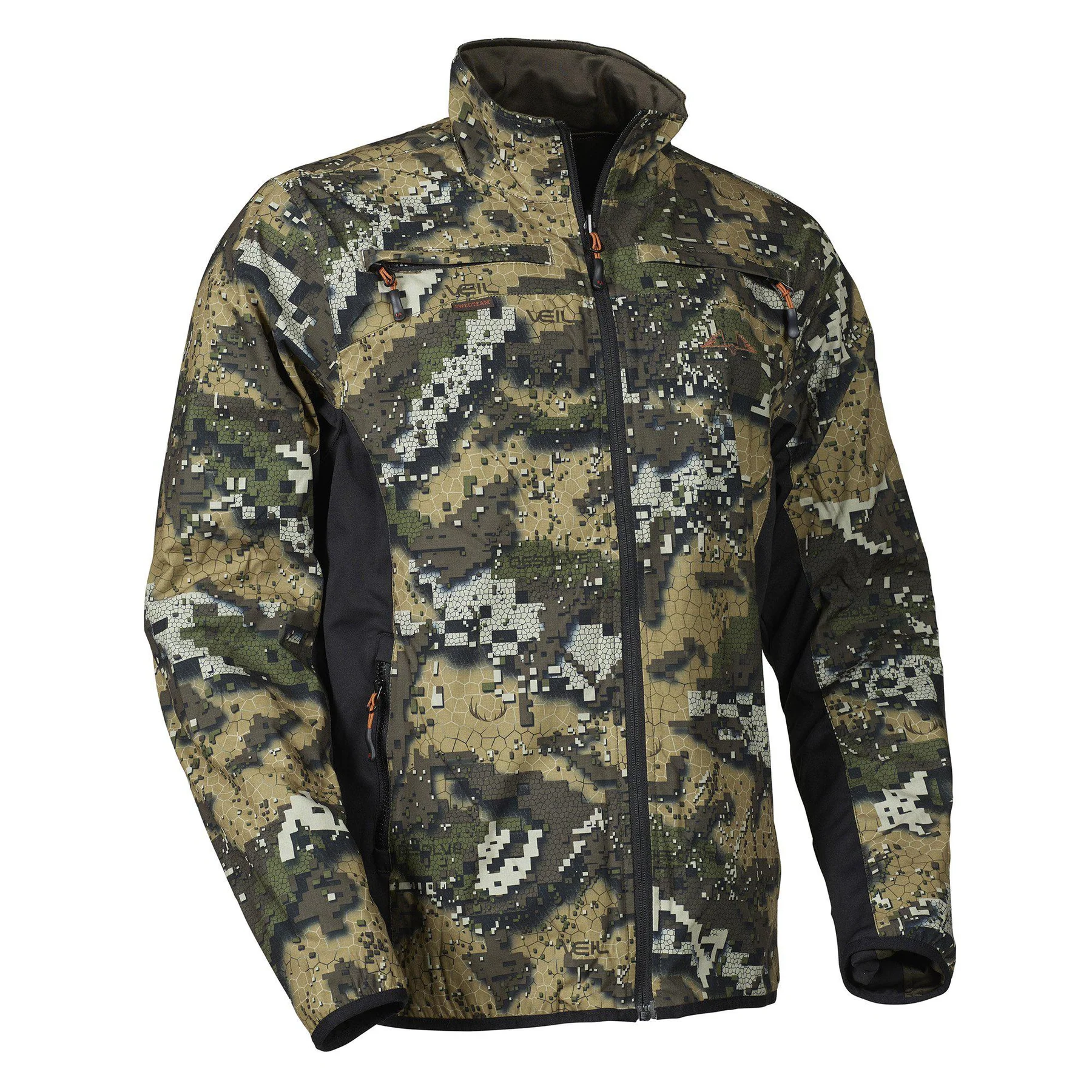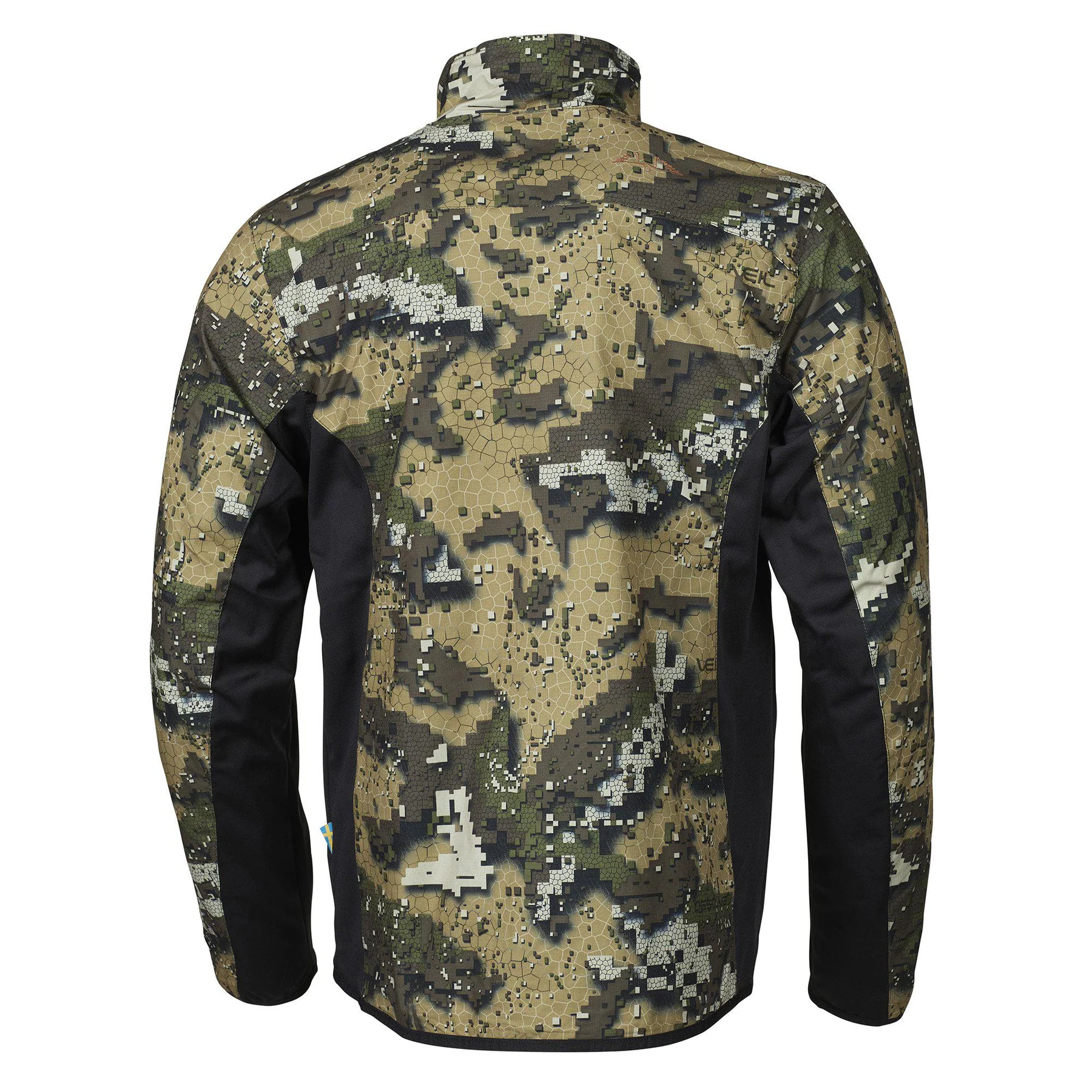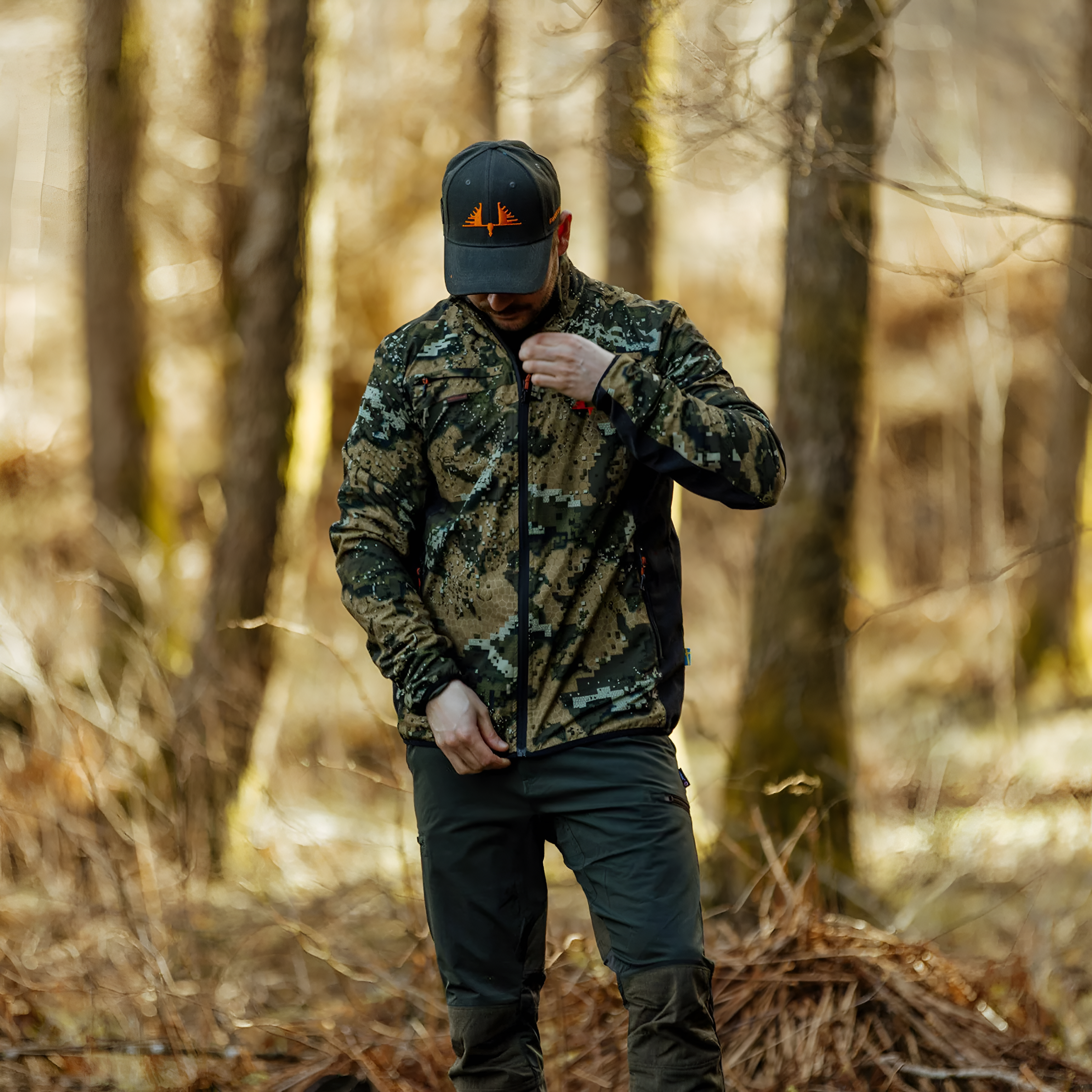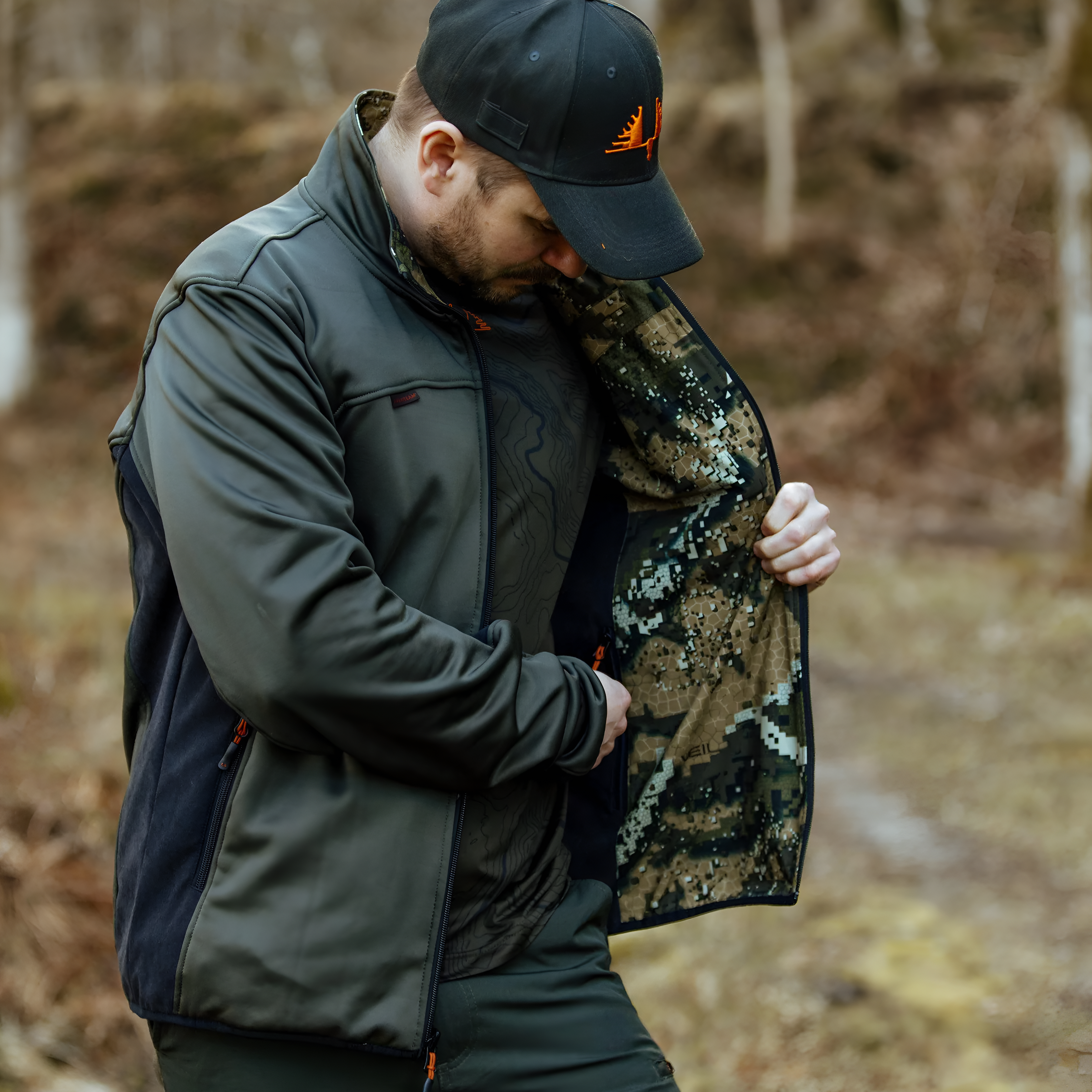 #100475 SWEDTEAM Virsjaka Ridege Pro divpusējā Veil Šī Swedteam jaka ir šūta pēc klasiska dizaina, tajā ir iestrādāta WINDBREAKER® membrāna, kas palīdz ķermeni pasargāt pret vēju un tā saglabāt siltumu. Šī iemesla dēļ arī apkakle ir nedaudz paaugstināta. Viena puse ir vienkrāsaini tumši brūna, bet otra puse ir ar DESOLVE VEIL® kamuflāžas rakstu. Tas ir kontrastains un izstrādāts, ņemot vērā dzīvnieku redzes īpatnības, līdz ar to palīdz vēl labāk nomaskēties un saplūst ar apkārtējās vides fonu. Jaku vari lietot ar jebkuru no krāsām uz ārpusi. Piemēram, medībās ar kamuflāžu uz ārpusi, bet ikdienā ar brūno krāsu uz āru. Abos sānos ir praktiskas kabatas, kurās vari glabāt dokumetus, cimdus, telefonu vai ko citu. To aizdarēs iestrādāti rāvējslēdzēji, lai mantas nevarētu nejauši izkrist. Aproces ir elastīgas, tās pieguļ rokām. Šo jaku ieteicams lietot kā otro vai trešo slāni.
