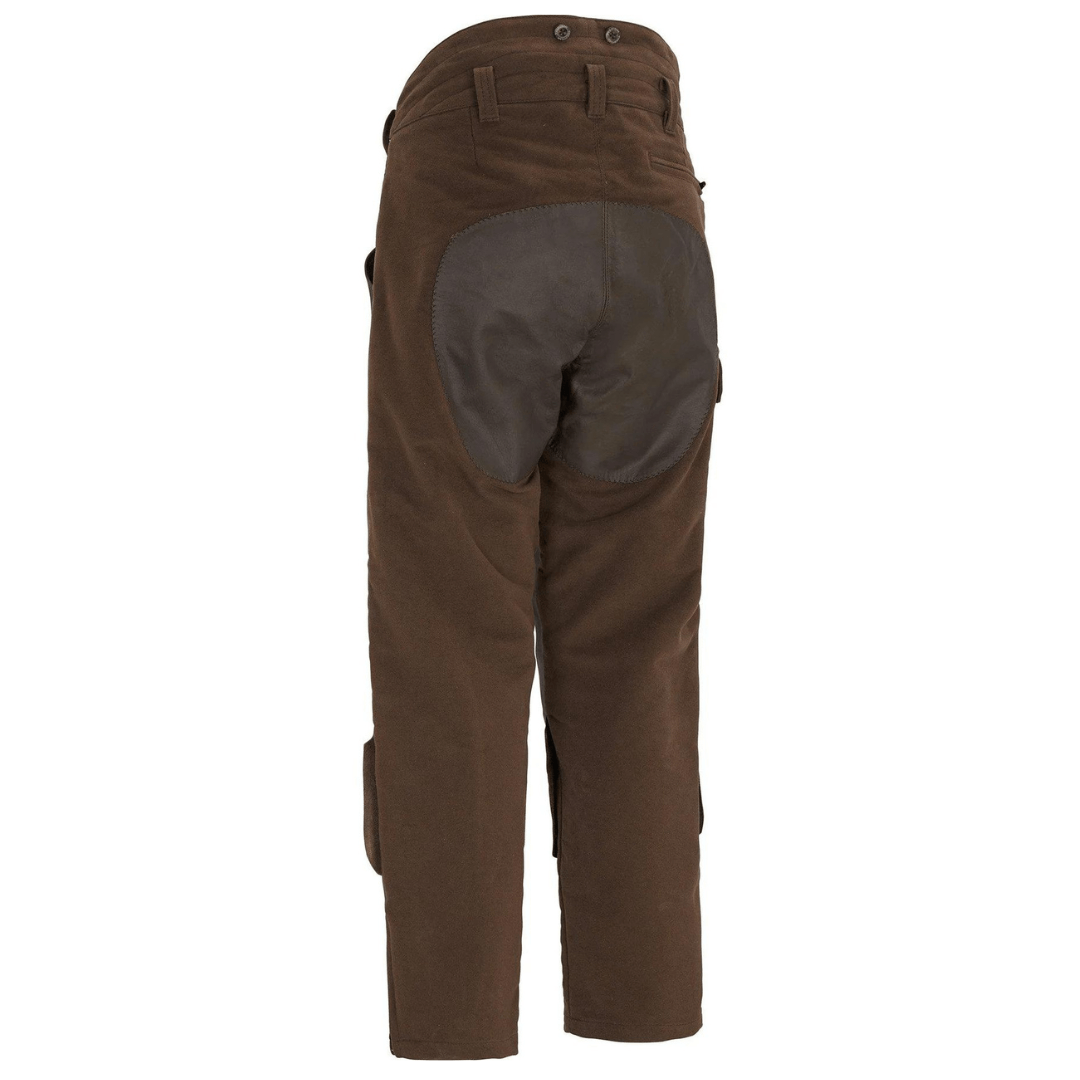 #100147 SWEDTEAM Trousers ELK LEATHER M Special hunting trousers with roomy fit. Made of moleskin and reinforced with skin on the entire front and bottom. Trousers with high back and buttons for braces; two front pockets and back pocket with zip.